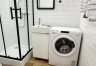- łazienka z WC, kabiną prysznicową, umywalka, lustro, pralka.
