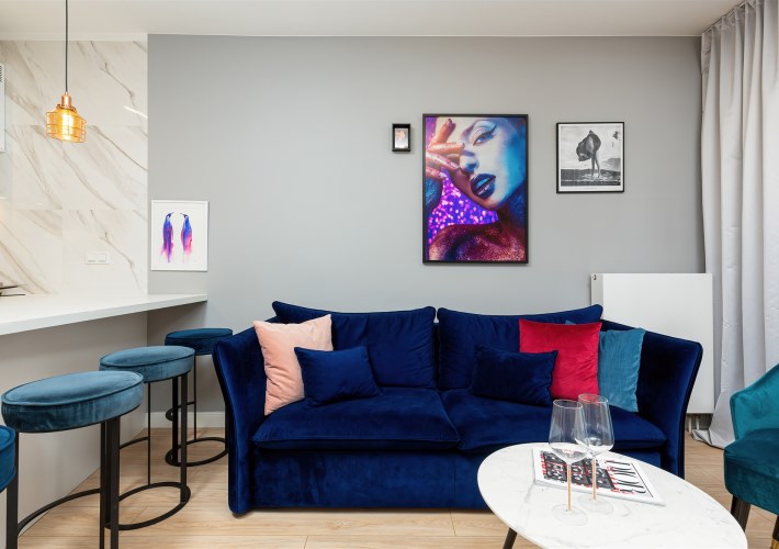 The flat is located on the first floor with a view of a quiet patio. It consists of two rooms, a bathroom with a toilet, and a hall. Beautifully arranged, the flat was designed by an architect with attention to every detail. Fully furnished. Ready to move in. The photos attached to the offer do not reflect the charm of the flat. The flat has a large loggia which can be accessed from the living room and bedroom. In front of the building there are parking spaces, publicly available in the parking zone.