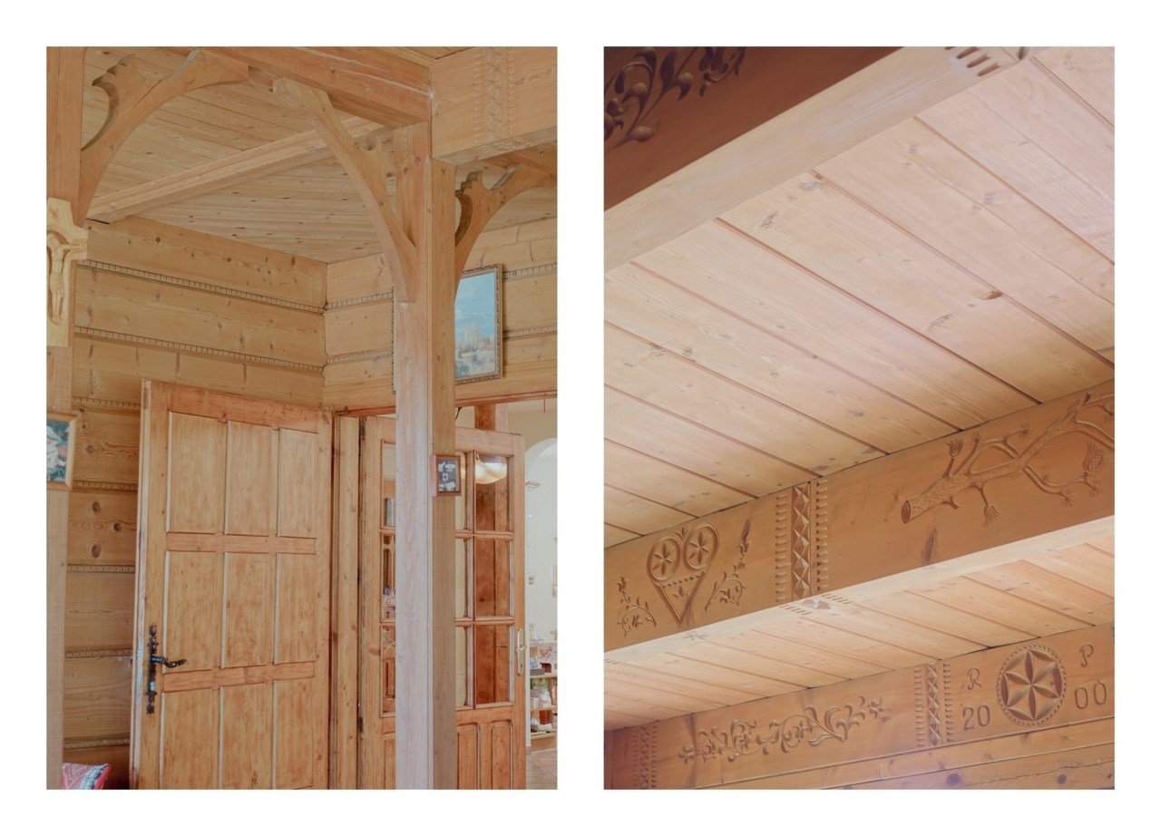 Konstrukcja – dom parterowy z poddaszem użytkowym, podpiwniczony z funkcjonalnym rozkładem pomieszczeń, odpowiednio doświetlony światłem dziennym z nietypową stolarką okienną i drzwiową wykonaną z najlepszego drewna na zamówienie. Ściany drewniane z bali, częściowo murowane z pustaków ceramicznych, ocieplone styropianem i otynkowane. Stropy nad piwnicą żelbetowy, nad parterem drewniany.