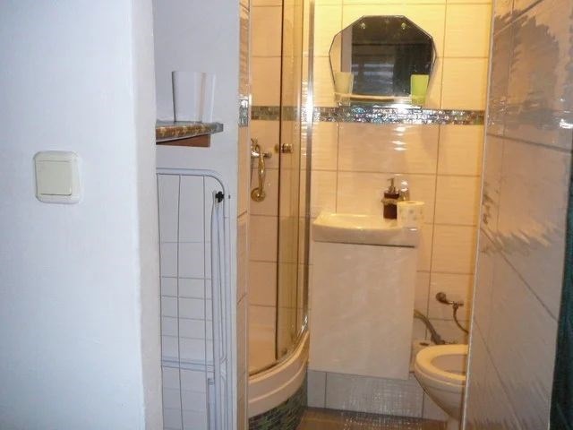 Łazienka z kabiną prysznicową, relatywnie nowa, wyremontowana 6 lat temu. Posiada niewielkich rozmiarów okno.