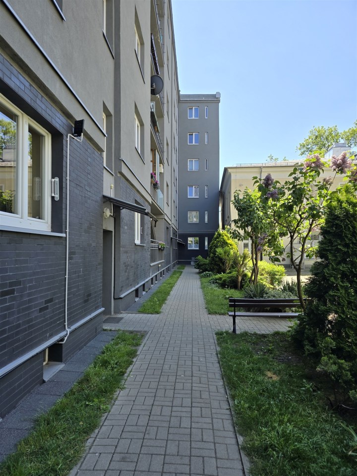 Mieszkanie jest dwustronne, składa się z oddzielnych, niezależnych dwóch pokoi, oddzielnej widnej kuchni, łazienki, wc, przedpokoju. Z większego pokoju wyjście na balkon z którego rozpościera się widok na zielone podwórze. W oknach pokoju z balkonem zamontowane rolety. W pokojach parkiet drewniany w idealnym stanie. W kuchni i łazience glazura, terakota starszego typu. Na balkonie ułożony gres wodoodporny. Mieszkanie wysokie, rozkładowe, bardzo jasne. Mieszkanie dwustronne.