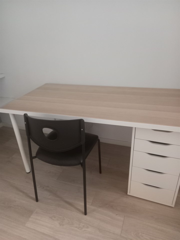 W pokojach są łózka, biurka , półki na książki i szafy.
